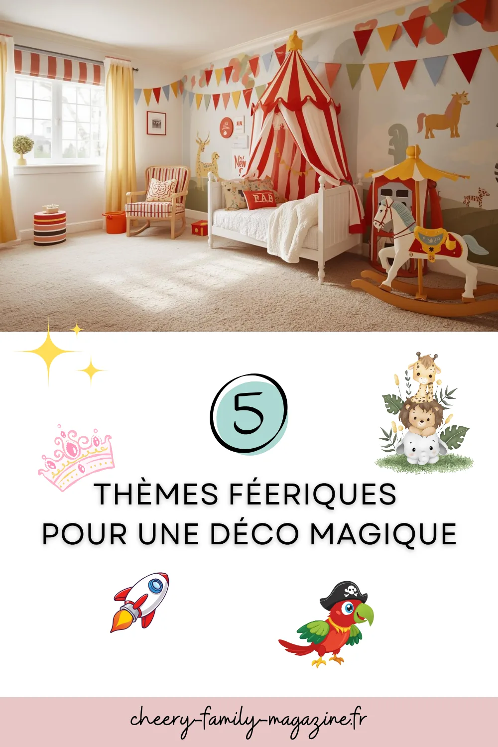 🎪 Le cirque, c’est la fête, le rire, la magie et le mouvement. C’est un thème très joyeux et coloré, idéal pour les enfants pleins d’énergie et qui aiment le côté spectaculaire. Attention, il faut l’équilibrer pour éviter que la chambre ne devienne trop fatigante visuellement !