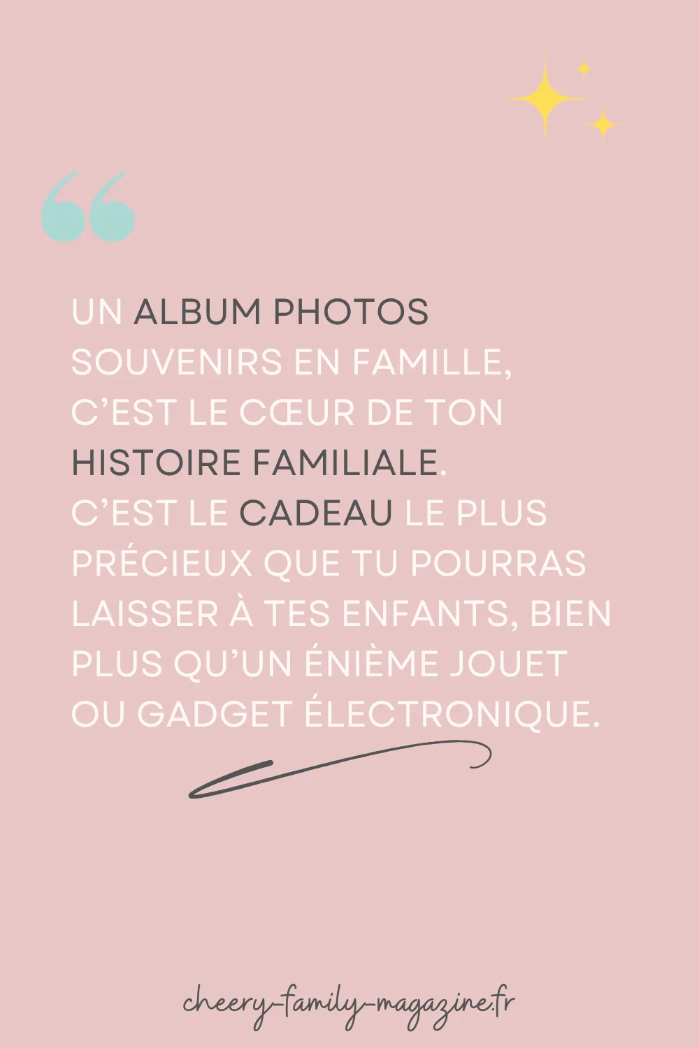 Voilà ! Tu as désormais toutes les clés en main pour passer à l’action. N’oublie pas : cet album, c’est le cœur de ton histoire familiale. C’est le cadeau le plus précieux que tu pourras laisser à tes enfants, bien plus qu’un énième jouet ou gadget électronique.
