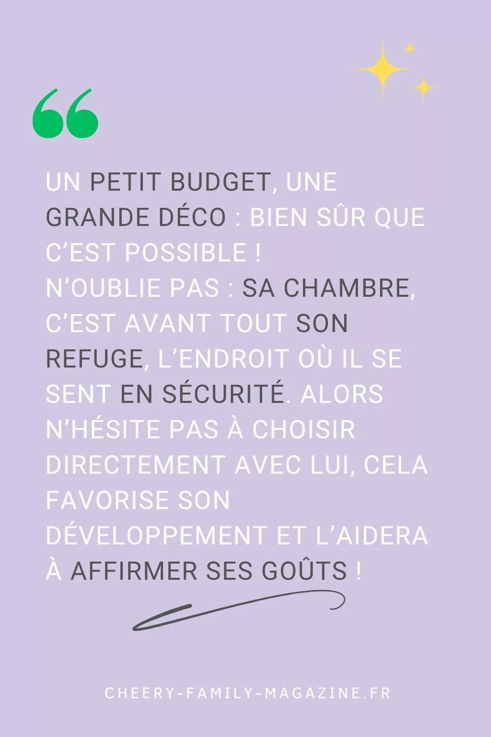 ➡️ Un petit budget, une grande déco : bien sûr que c’est possible ! Grâce à tous les conseils partagés dans cet article, tu n’as plus d’excuse pour aménager la chambre de ton enfant. Et surtout, n’oublie pas : sa chambre, c’est avant tout son refuge, l’endroit où il se sent en sécurité. Alors n’hésite pas à choisir directement avec lui, cela favorise son développement et l’aidera à affirmer ses goûts !