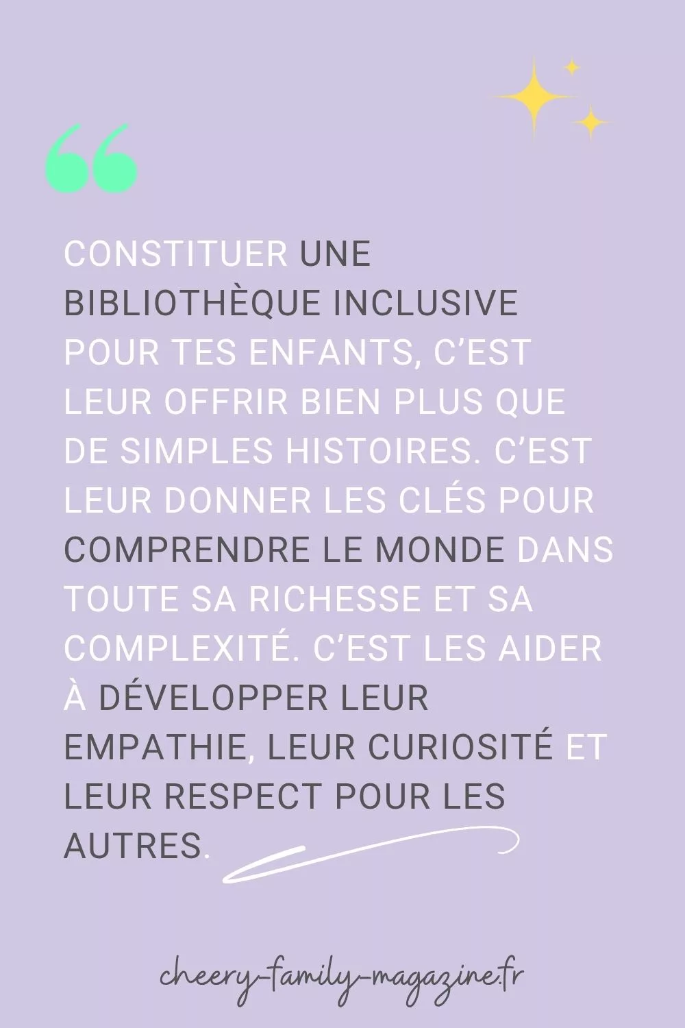 - Renforcement des valeurs familiales : la constitution d’une bibliothèque inclusive est l’occasion de transmettre tes valeurs familiales d’ouverture, de respect et de tolérance. Ces moments de choix et de partage autour des livres créent des souvenirs durables et renforcent les liens familiaux.