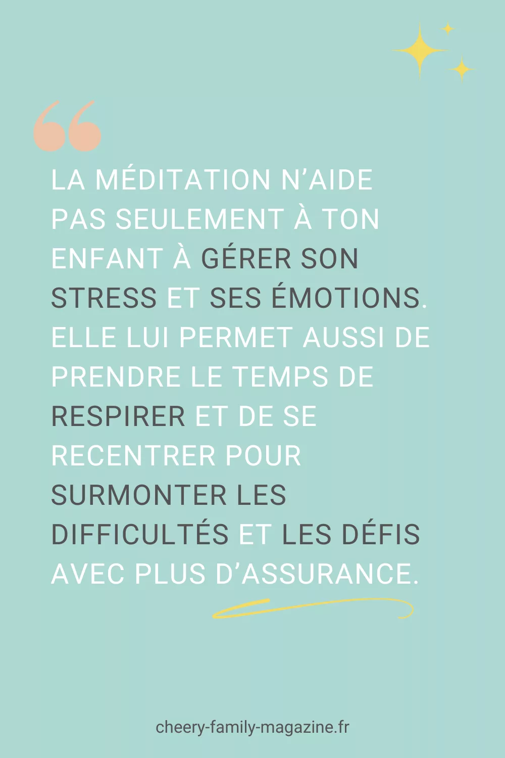 La méditation n’aide pas seulement à ton enfant à gérer son stress et ses émotions. Elle lui permet aussi de prendre le temps de respirer et de se recentrer pour surmonter les difficultés et les défis avec plus d’assurance. Des exercices tels que la visualisation positive – méthode qui consiste à utiliser le pouvoir de l’esprit pour construire des images positives et réconfortantes afin de se sentir mieux ainsi que d’augmenter sa confiance en lui.