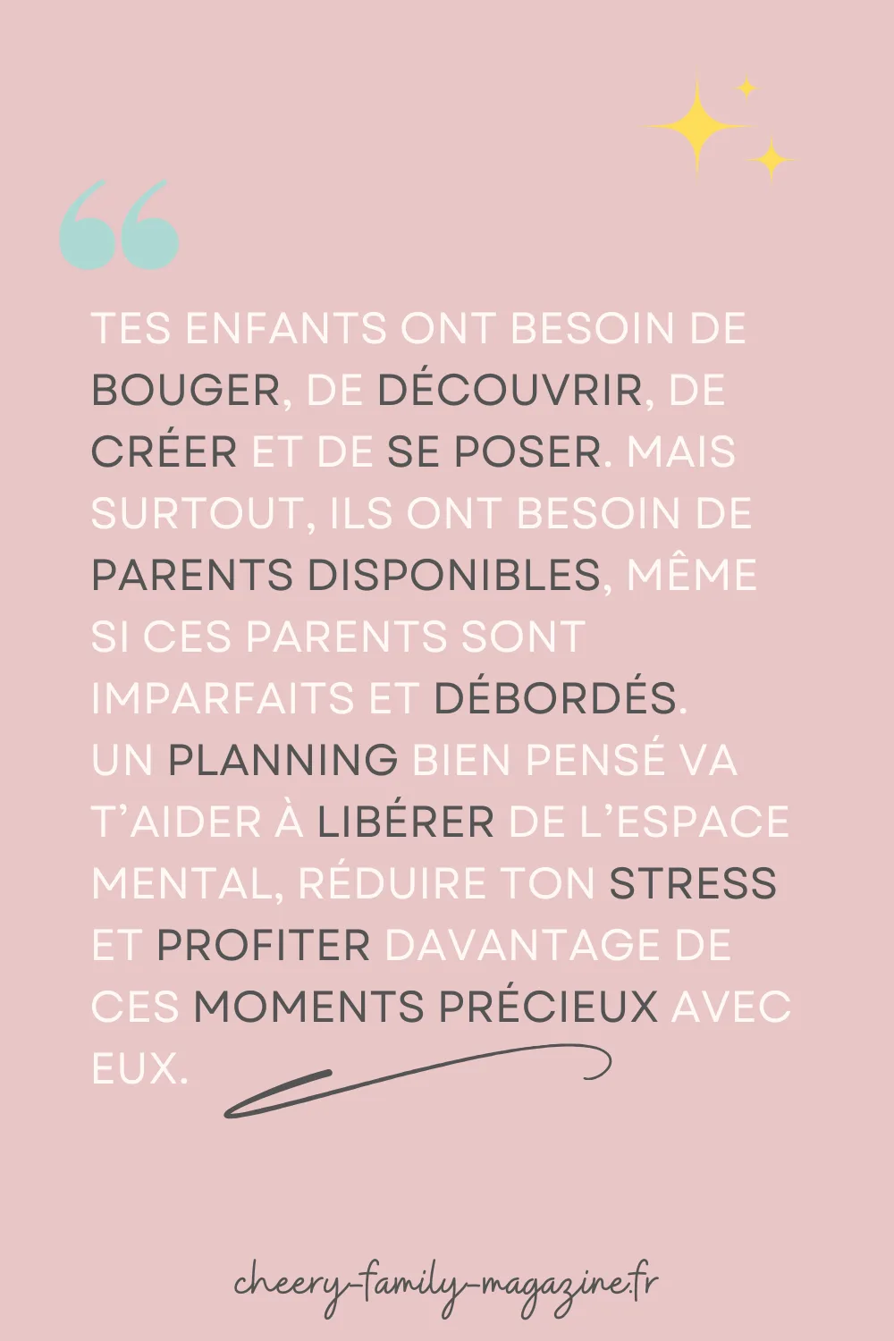 Tes enfants ont besoin de bouger, de découvrir, de créer et de se poser. Mais surtout, ils ont besoin de parents disponibles, même si ces parents sont imparfaits et débordés. Un planning bien pensé va t’aider à libérer de l’espace mental, réduire ton stress et profiter davantage de ces moments précieux avec eux.